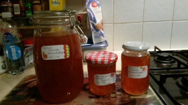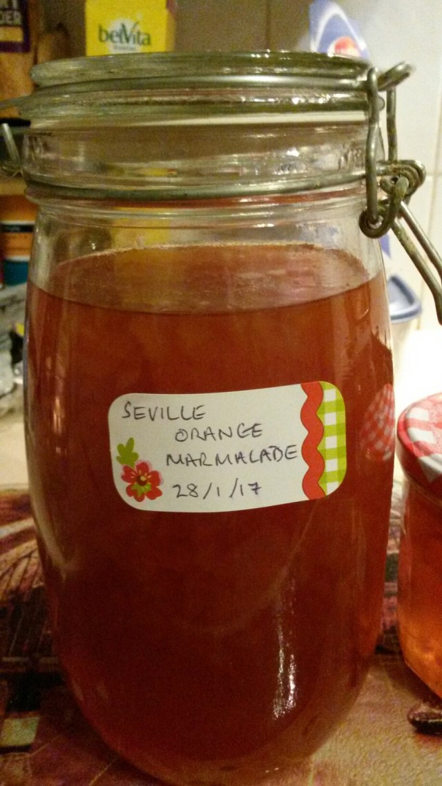 Waitrose had marmalade making ingredients on offer. So i thought how hard can it be?! First of all it took me 1 1/2 hours to prepare the fruit. Secondly it took soooo long to get the mox to the relevant setting point (thank goodness for Aldi jam and sweet thermometer -worthwhile investment some years ago). I sterilised old jam jars and some huge Kilner jars (well loved and used over the years) with baby bottle sterilising fluid.